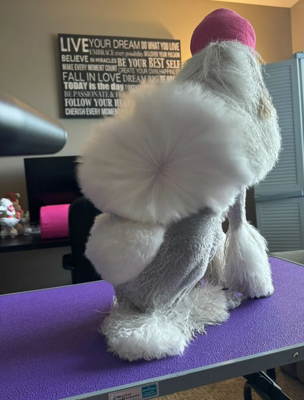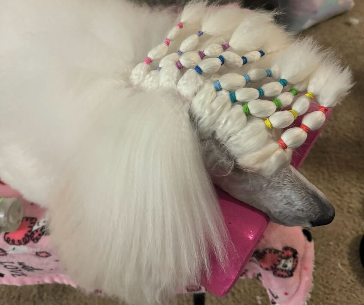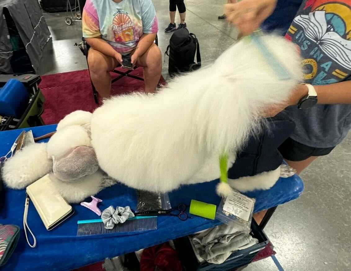 A poodle’s coat changes as they grow, and understanding these stages is key to proper grooming. Puppies start with a soft, fluffy coat that gradually transitions into the adult coat, which is denser, curlier, and more textured. During this coat change the coat can be more prone to matting, especially if kept long. Different techniques are used, such as banding and wrapping, once the hair becomes long enough to manage the coat.